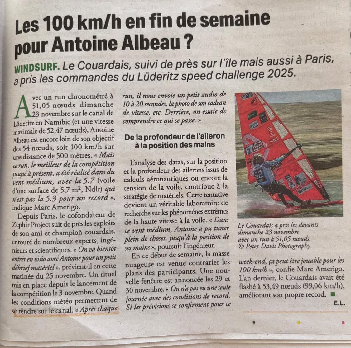 LE PHARE DE RE / Print & Web – 25 novembre 2025 : « Les 100 km/h en fin de semaine pour Antoine Albeau ? » (Lien Article Web) (Lien Article Journal)
